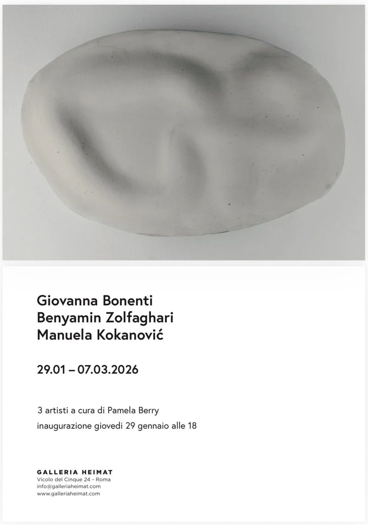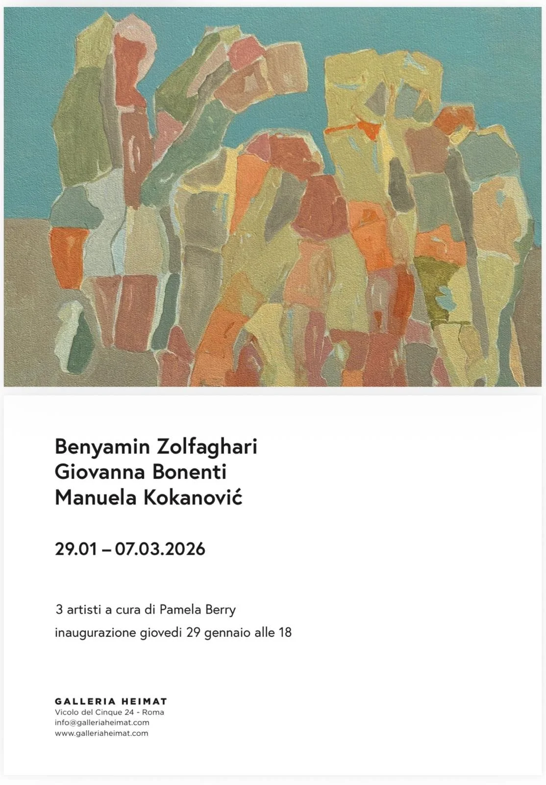 Benyamin Zolfaghari attended courses at art academies in Tehran and Rome, graduating in sculpture and photography. Self-taught as a painter since 2016, he has participated in exhibitions including the art fair "The Others," Turin (2022); group exhibitions at the Temple University Rome campus, Spazio Mensa, Rome (2021); solo exhibition at the Curva Pura gallery, Rome (2021); and the two-person exhibition "Lessico familiare," Curva Pura (2025). He has exhibited in various Iranian galleries such as 0 Gallery, Etemad, and Aknoon. Articles about his work have appeared in Artribune, Exibart, and Segnonline.